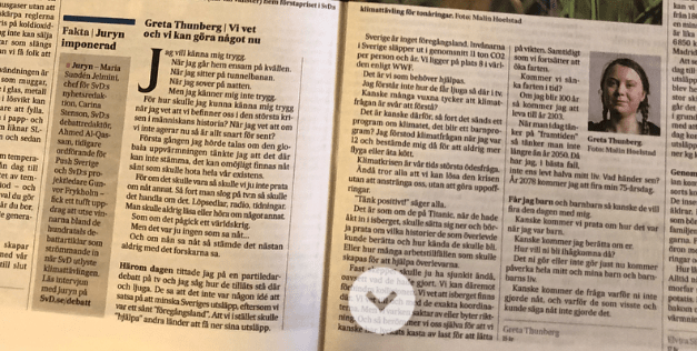 Però el cert és que la seva entrada en l’escena de l’activisme mediàtic va ser gairebé 3 mesos abans, el 30 de maig (o sigui, avui fa 3 anys exactes) amb la publicació d’un article al diari Svenska Dagbladet, el tercer de més circulació a Suècia. Aquesta publicació va ser fruit d’un concurs del diari, que va demanar articles sobre el canvi climàtic escrits per joves. Aquesta és la nota que va publicar el diari per acompanyar-lo: